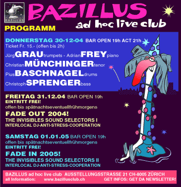 31.12. Adrian Frey Trio Sylvesterzauber Zürich 30.12. Grau/Münchinger/Frey/Sprenger/Baschnagel Bazillus, Zürich 17.12. Christoph Grab Quartett Kulak 09.12. 4 Bassgeigen Club Hey, Zürich 03.12. Blakey Projekt Jazzclub Aachen 04.12. Heimat - Lebenslänglich (Filmmusik) Kino Männedorf 27.11. Blakey Projekt Jazzclub Villingen 26.11. Blakey Projekt Lünen 25.11. Blakey Projekt Leverkusen, Topos 20.11. 4 Bassgeigen Jecklin, Zürich 19.11. Feucht - Krisch - Sprenger Stuttgarter Jazztage, Merlin 14.11. Luther Big Band Stauffacher Kirche, Zürich 04.11. D'Episcopo-Canonico-Sprenger Zürich, Eden Au Lac 30.10. Christoph Grab Quartett Schlosshof, Altikon 29.10. Christoph Grab Quartett Jazzfestival Richterswil 28.10. Christoph Grab Quartett Hotel Jakob, Rapperswil 14.10. Christoph Grab Quartett Moods, Zürich 09.10. Thomas Bannholzer Projekt Jazzherbst Konstanz 07.10. Christoph Grab Quartett Spinnihalle Baar 02.10. Christoph Grab Quartett Sunnehof Uznach 19.09. Jochen Baldes Quartett: Subnoder Jazz in Olten 18.09. Jochen Baldes Quartett: Subnoder Birds Eye, Basel 26.08. "play off" Soundinstallation zur Ausstellung von Katharina Henking mp3-download Gallerie Commercio